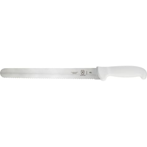 This Mercer Culinary® Ultimate White® Slicer features a wavy edge that is ideal for cutting soft products with hard crusts or skin, like bread, tomatoes, and sausages. Its blade is made from high carbon stain-free steel and it has a white polypropylene handle.