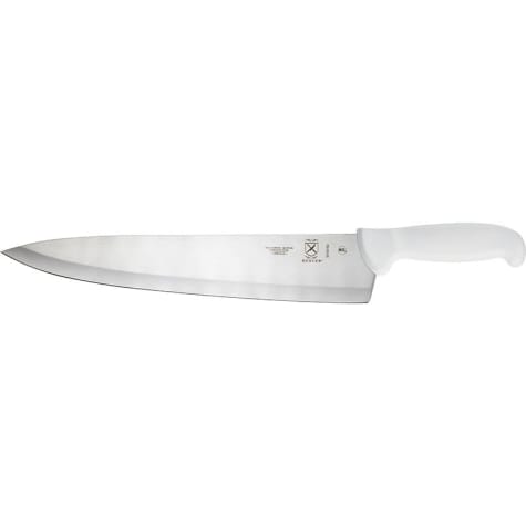 This Mercer Culinary® Ultimate White® Chef's Knife has a longer 12" blade that allows you to cut more at once. It features a high carbon stain-free steel blade and white polypropylene handle.