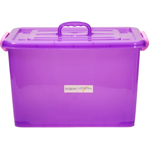 This Mercer Culinary® Allergen Safety Storage Tote comes in a purple color, which clearly identifies products designated for allergen or gluten-free use. It has a handle for easy carrying and a locking lid to prevent dust and dirt from getting inside.