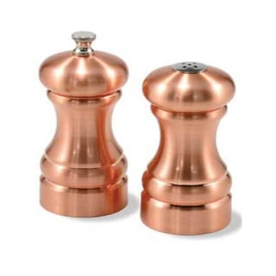 This Columbia metal salt shaker and pepper mill set has a beautiful bronze finish that will enhance your tabletop.