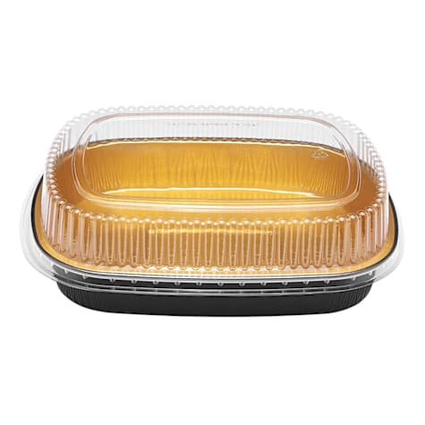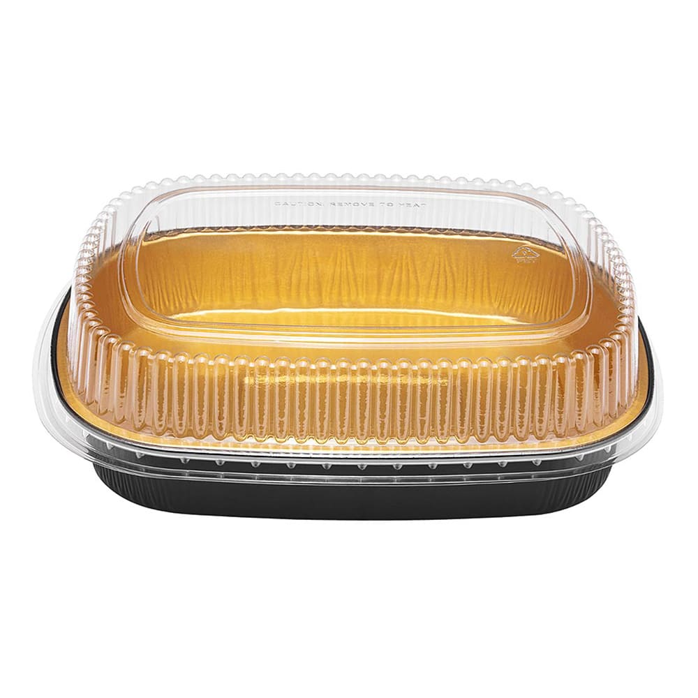 These black and gold aluminum takeout containers are the choice storage solution for food on the go. Pack leftovers or freshly-prepared hot meals for your customers to take home.