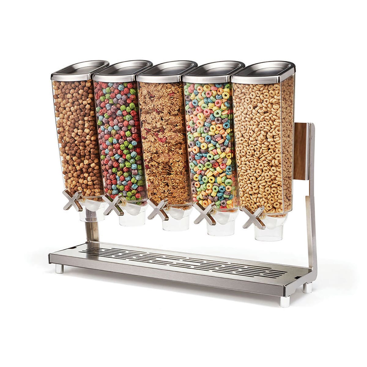This Rosseto® EZ-Pro™ Table Top Dispenser includes five ABS containers with a 1 gallon capacity each. This dispenser is perfect for dry goods such as cereal, candy, nuts, and more. It has silicone wheels which dispense 1 Oz. servings, reducing food waste. This dispenser is NSF Listed.