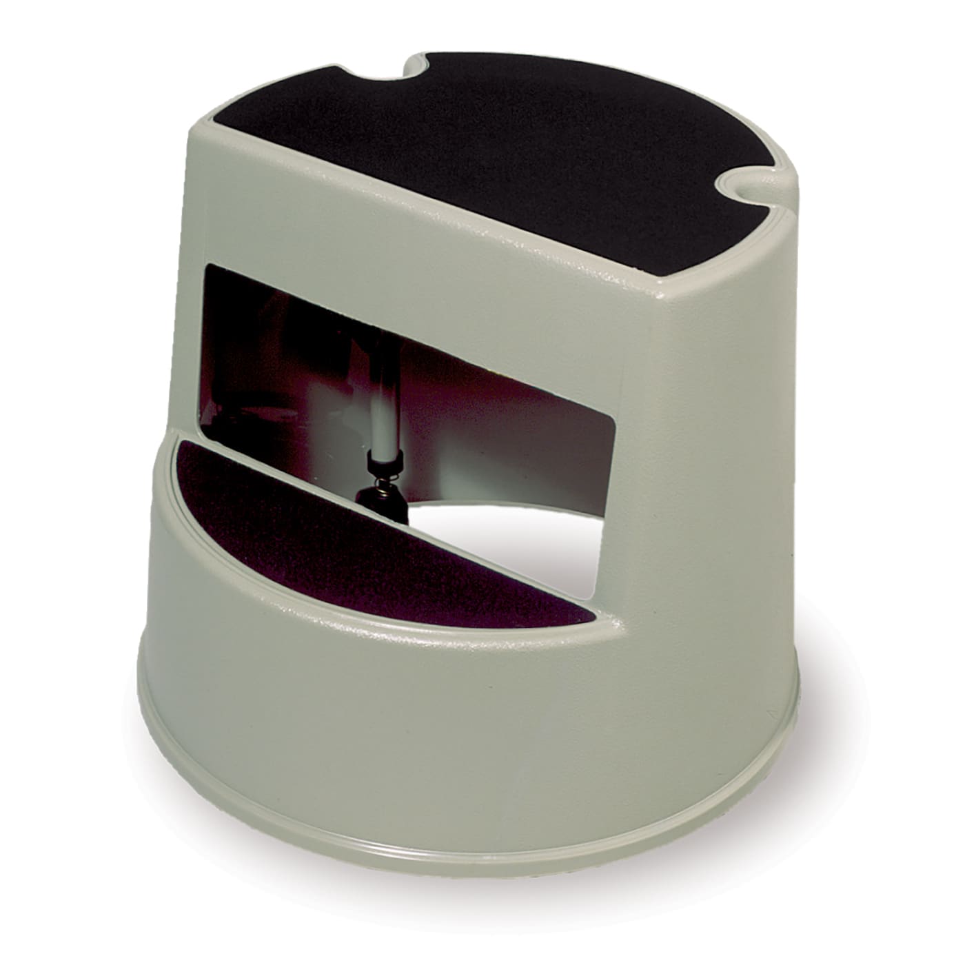 This mobile stepstool is 16" round x 13" high and features retractable rubber casters and soft, slip‐resistant step pads. The casters allow it to glide easily when pushed, then retract into the base when stepped upon to ensure stability. The heavy duty plastic construction will not damage walls or furniture, and holds up to 350 lbs.