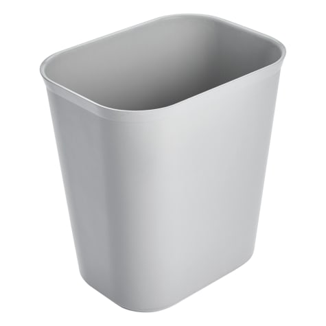 This gray 14 quart wastebasket is made of long‐lasting fiberglass that is rustproof, resists chips and dents, and is fire‐safe. It also features rounded corners that add strength and make it easy to clean, as well as a textured finish that hides scratches.