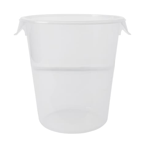 This clear round 8 quart storage container with easy‐to‐read graduations features a reinforced rim, user‐friendly handles with dishwasher drain hole, and a stacking, nesting design that saves you space. It is also dishwasher safe and withstands temperatures from ‐20°F to 212°F.