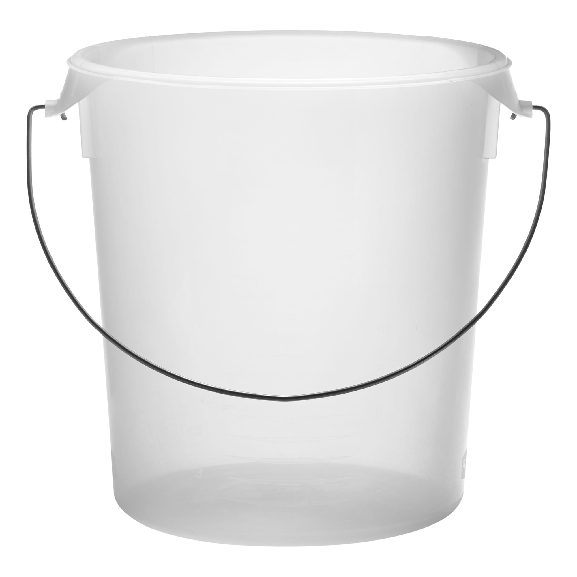 This clear round 22 quart storage container with easy‐to‐read graduations and convenient bail handle features a reinforced rim, user‐friendly handles with dishwasher drain hole, and a stacking, nesting design that saves you space. It is also dishwasher safe and withstands temperatures from ‐20°F to 212°F.