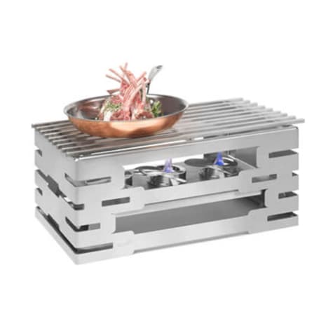Add a modern look to your buffet area with this Multi-Chef™ food warmer. The reversible 2-height burner stand can accommodate full-size chafer water and food pans in the low position, or use the grill top with the burner stand in high position.