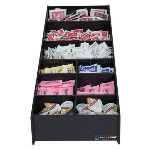 This San Jamar® Organizer keeps straws, stirrers, packets, and creamers organized and easily within reach. It is made from black polystyrene.