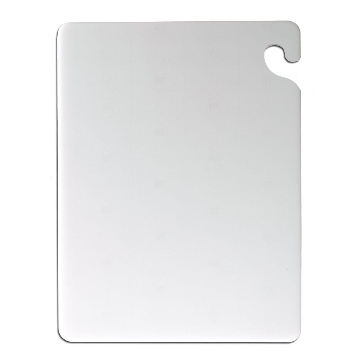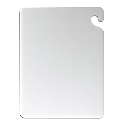This San Jamar® Cut-N-Carry® Cutting Board comes in a white color and is made from a co-polymer blend. It resists cut-grooving to prevent the dulling of knives, and has a patented Food Safety Hook for safe storage. This cutting board is dishwasher safe, and NSF Certified.