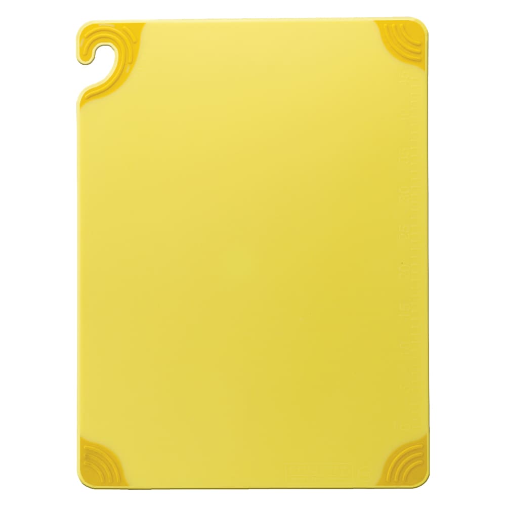 This San Jamar® Saf-T-Grip® cutting board is made out of a durable co-polymer material which can withstand high temperatures and will not warp. Its easily identifiable yellow color makes it ideal for preventing cross-contamination. Molded-through grip corners provide stability during use. This item is dishwasher safe and NSF listed.