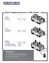 These twin stainless steel water-bath warmers from Server Products feature individual thermostats and power switches for each well. Adjustable thermostats, sense food temperature and turn each 500 watt heating element on or off as needed eliminating burning or scorching. This 120V model includes (2) stainless steel pumps. The stainless steel pumps dispense directly from a #10 can or your 3 quart stainless steel jar 94009. A 1 ounce serving is the maximum portion which can be reduced in 1/8 ounce increments, using the supplied gauging collars.