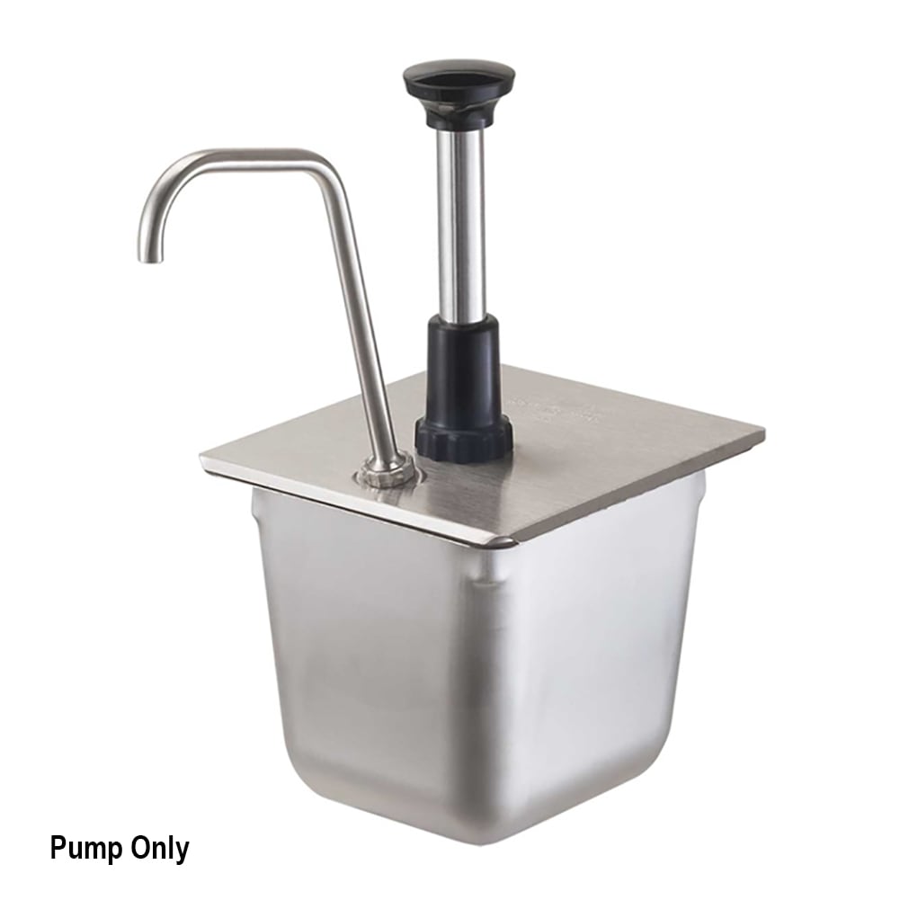 This stainless steel pump dispenses thin, toppings and sauces from a 1/6-size pan in a heated or chilled or food table. A full portion is 1 oz and can be reduced in 1/8 oz increments. Steam table pan is sold separately.