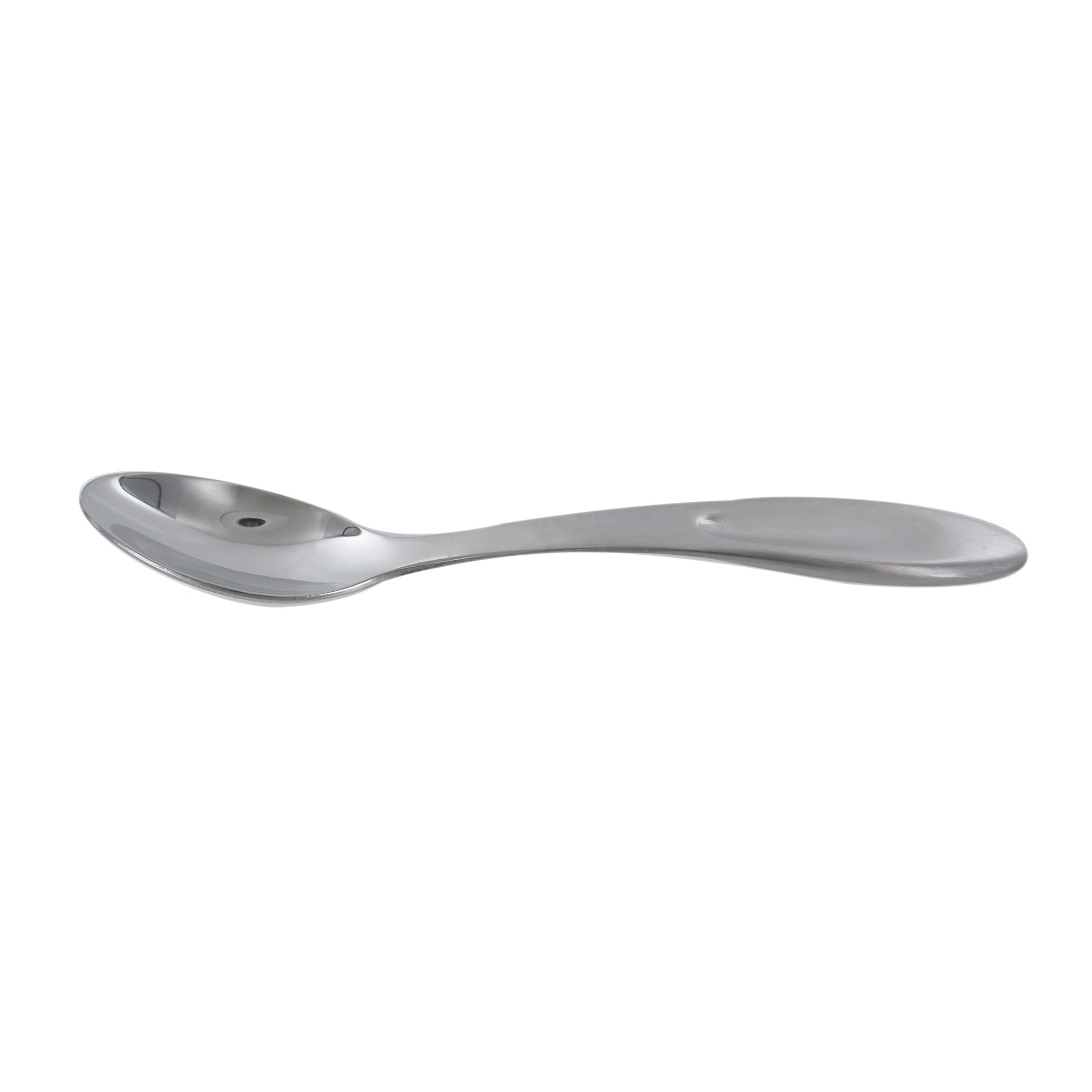 This stainless steel spoon features a one piece construction that eliminates food entrapment. The bowl has a mirror finish and the handle has a satin finish.