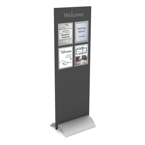 This AeroLinea® black double-sided floor stand display from Visual Graphic Systems features a silver base and includes four vertical lenses that hold 11"H x 8.5"W inserts. The silver vinyl WELCOME message at the top is easy to see.