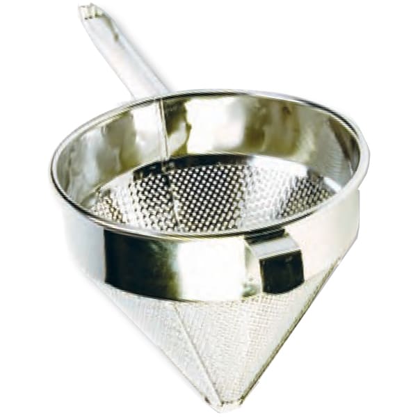 This strainer from Darling Foodservice is made of stainless steel with a reinforced rim.