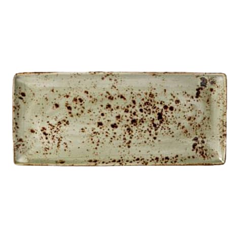 This Steelite rectangular platter is part of the Performance Craft Green collection and is perfect for displaying appetizers or desserts. It measures 14 1/2 x 6 1/2" and the gem like glaze will be sure to impress any guest.