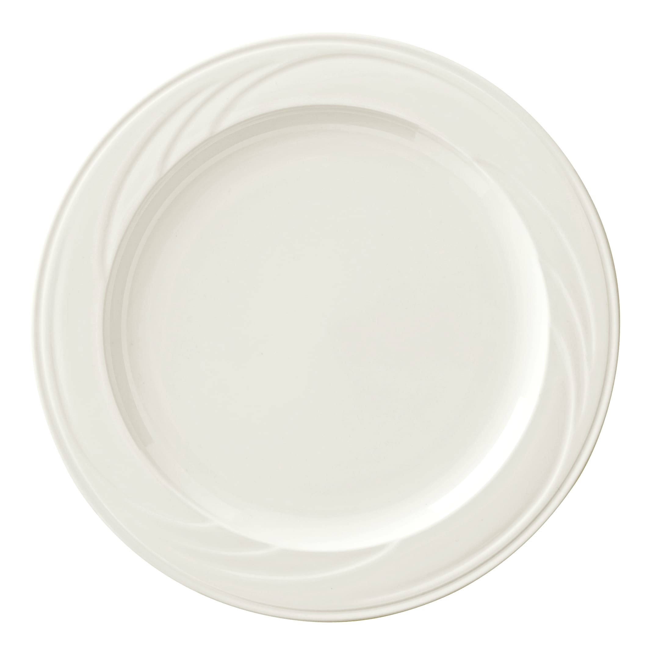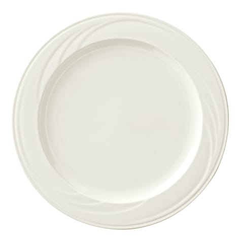 This 9.13" plate features the swooping wave designs of the Turina shape with the undecorated flint white body of the Cascade pattern and a low-profile design that gives you 30% more stacking space.
