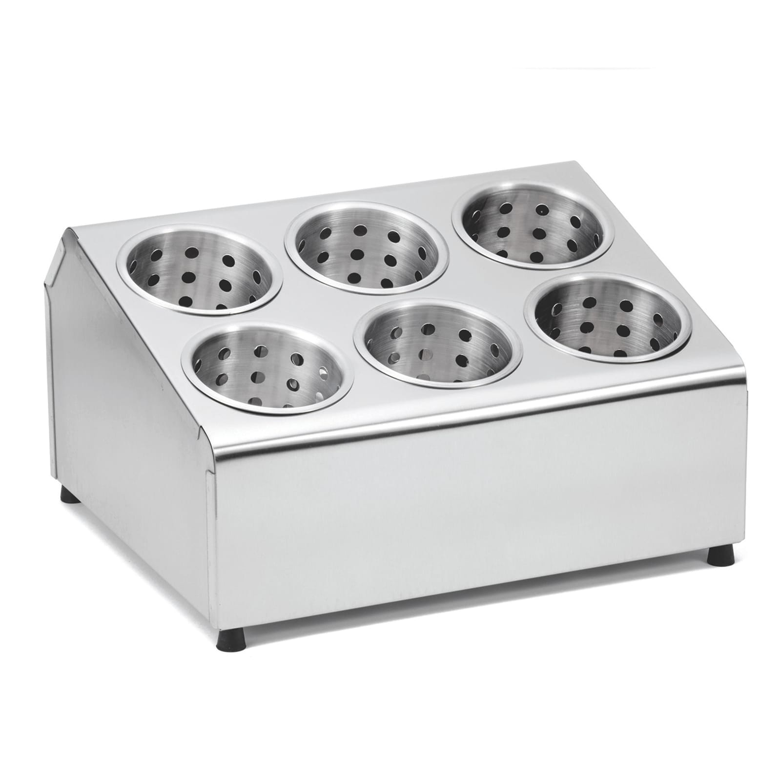 This two‐tier flatware cylinder holder from TableCraft is constructed of durable stainless steel material. It has six holes for flatware cylinders and is perfect for buffets or cafeterias. NOTE: Does not contain cylinders. Use with NY33 or PP33 cylinders.