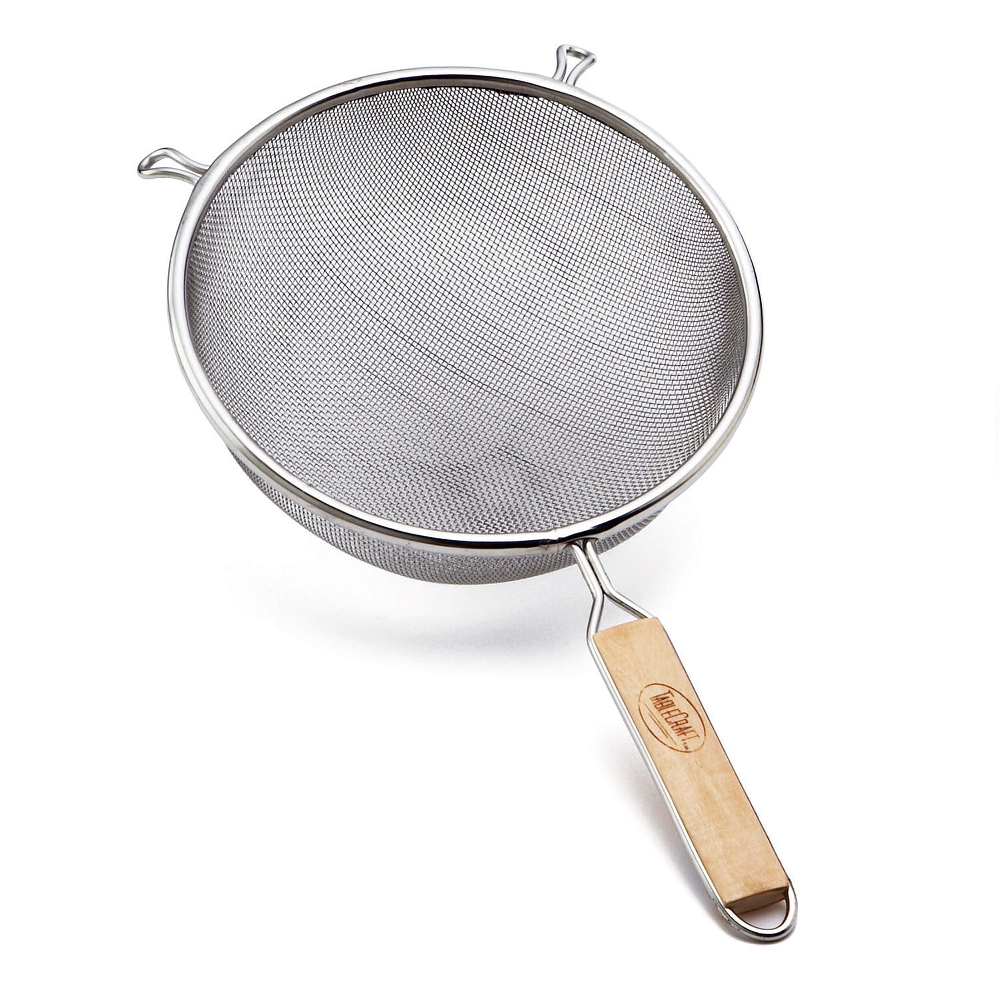 This TableCraft 8" diameter tinned single fine mesh strainer is great for sifting flour. It has pan hooks and a flat‐bottom handle that provide hands‐free use while the strainer sets on the pan's rim. The strainer is re‐tinned, has a lacquered wood handle and an outer reinforcing mesh.