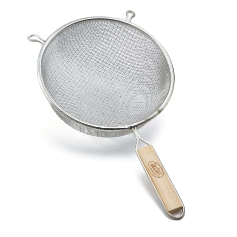 This TableCraft 7‐3/4" diameter tinned double medium mesh strainer has a lacquered wood handle and an outer reinforcing mesh. This strainer is perfect for straining liquids. It includes pan hooks and a flat‐bottom handle for hands‐free use while the strainer balances on the pan's rim.