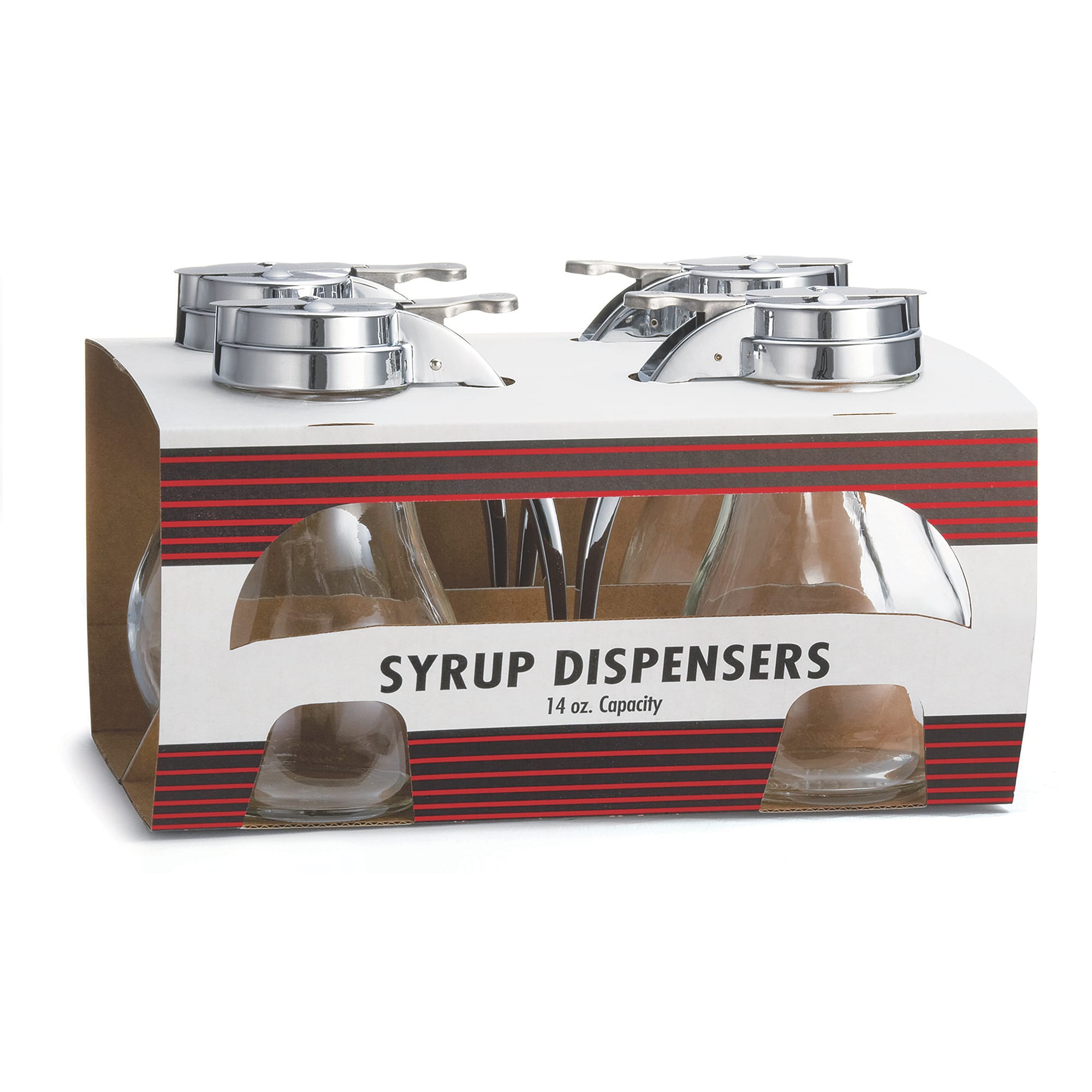 This TableCraft 14 ounce syrup dispenser features a glass container and chrome plated metal top that crews off easily for cleaning and refiling. The teardrop shape provides a modern look.