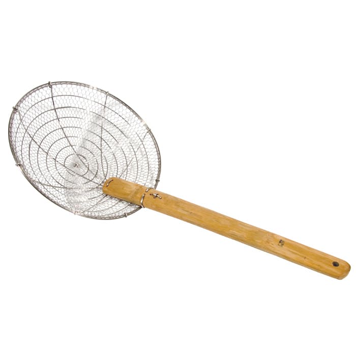 This Town Food Service Skimmer has a 12" diameter and is great for blanching a variety of items. It features coarse stainless steel wire, and is finished with a 14.5" bamboo handle.