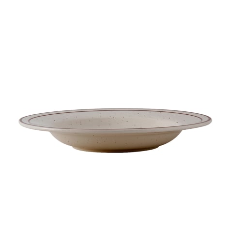 Serve your favorite pastas in this 15 ounce pasta bowl from Tuxton®. It is perfect for use in restaurants, diners or healthcare facilities as it is very durable and has a Lifetime Edge Chip Limited Warranty. This bowl is eggshell in color with brown speckle and brown bands around the edge. It is also microwave safe, dishwasher safe and oven proof.