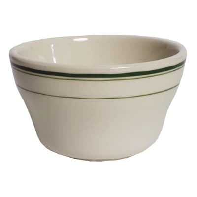 Allow your guests to sip hot soup from this 8 ounce bouillon cup from Tuxton®. It is part of the Green Bay series and is eggshell in color with green bands around the edge. This bouillon cup is perfect for use in restaurants or diners.
