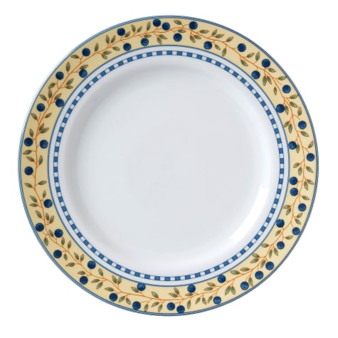 Frame your desserts on this plate trimmed with a beautiful blueberry design. All Vertex China is made from lead‐free china and is dishwasher, oven, and microwave safe.