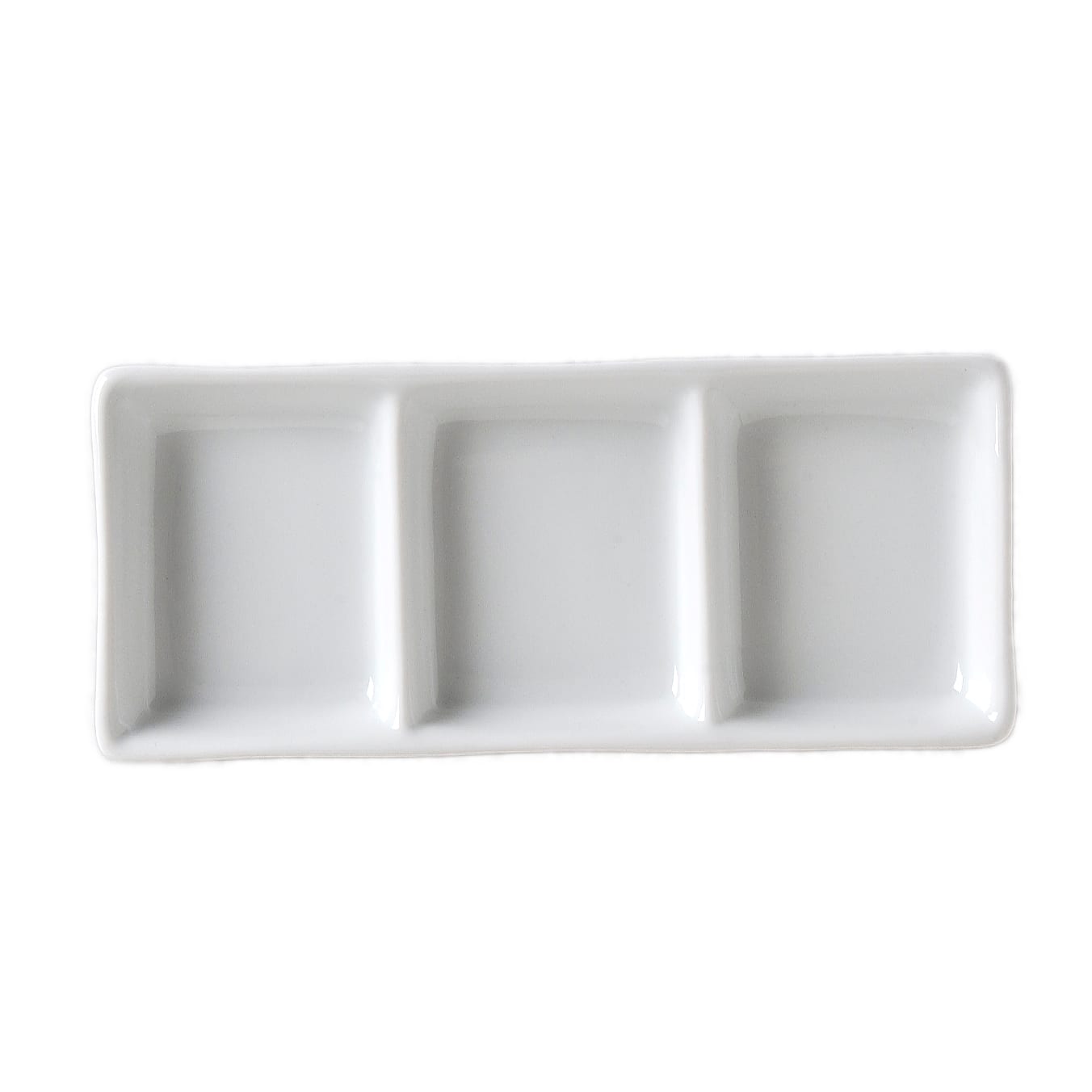 This 3‐compartment sauce dish is great for offering a variety of small appetizers or sauces.