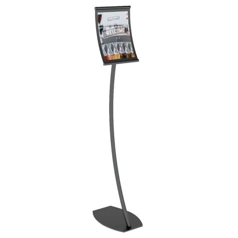 This VGS black Concurva® floor stand sign holder display has a magnetic lift‐up MagaLens® cover for easy insert changes. The overall size is 52" high x 9.5" wide x 14" deep. The insert size is 11" high x 8.5"w.