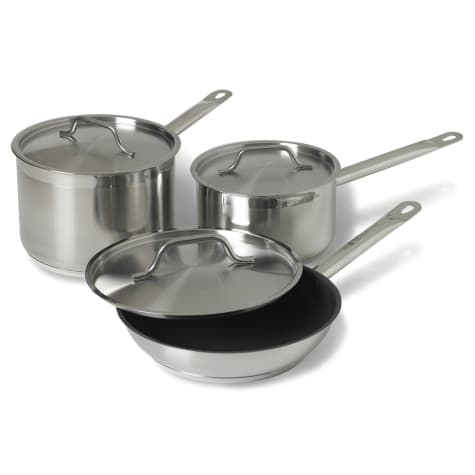 The Vollrath Optio cookware set is perfect for the value-conscious chef. Use this cookware set for browning, frying, sautéing, simmering, and more. Constructed of high-quality stainless steel, this cookware set resists corrosion, discoloration, and flavor retention.