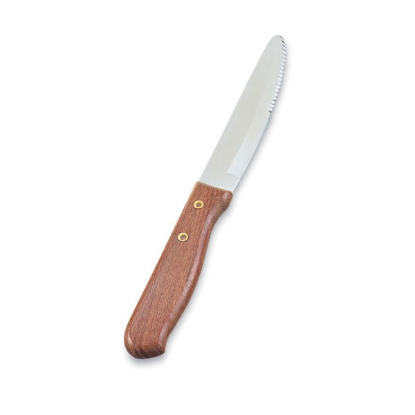 This serrated steak knife has a 5" stainless steel blade and a riveted wooden handle.