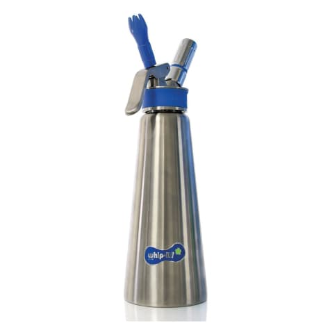 This whip-it! Whipped Cream Dispenser features a 100% stainless steel body and head and includes three decorating tips. Just add fresh whipping cream and sugar, insert chargers, shake the dispenser for thirty seconds, and then enjoy whipped cream. This dispenser is NSF certified and commercial dishwasher safe. It comes with a limited lifetime warranty.