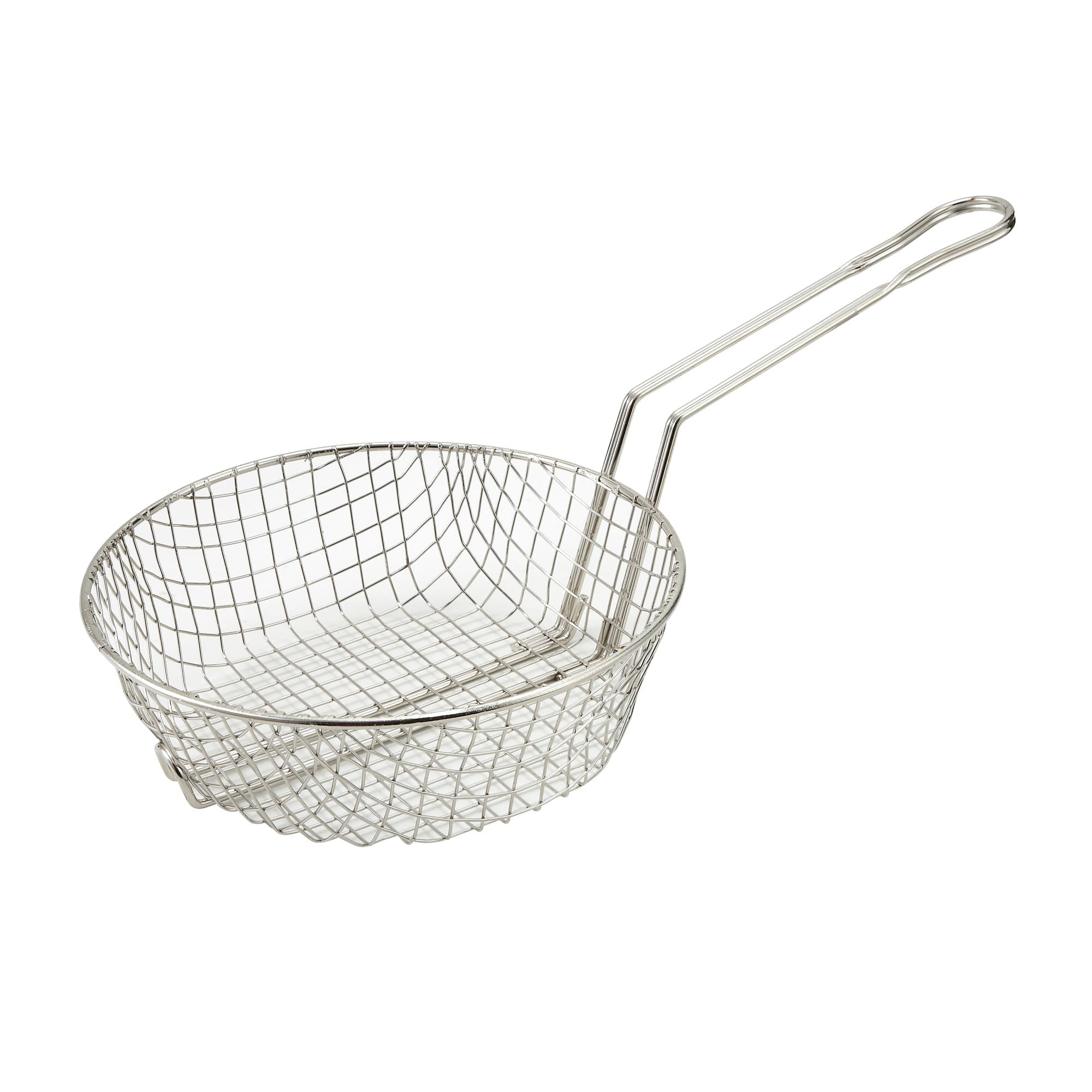 This Winco® MSB-10 nickel plated mesh basket is ideal for deep frying any food this is lightly to heavily-breaded. Very easy to clean and maintain. Designed with a fire resistant handle in order to ensure employees safety.