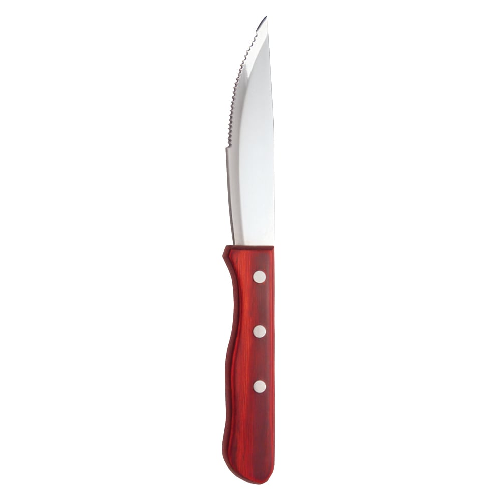 This 10" Beef Baron II steak knife features a stainless steel blade and a red Pakka wood handle. These knives are commercial dishwasher safe. It is recommended that they are washed standing up in a flatware rack and not laying flat in a open rack.