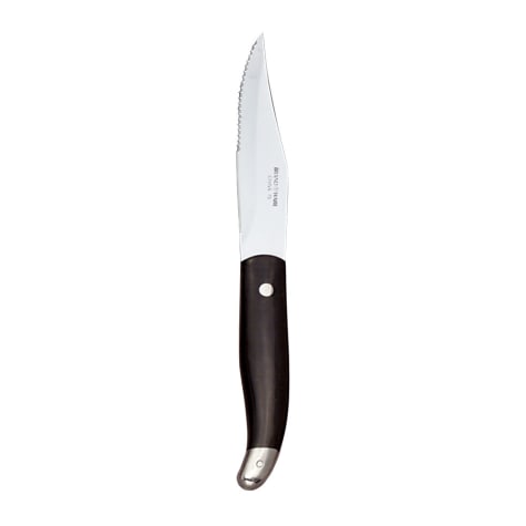 This 9‐3/4" Baron Euro style steak knife features a stainless steel blade and a black plastic handle. These knives are commercial dishwasher safe.