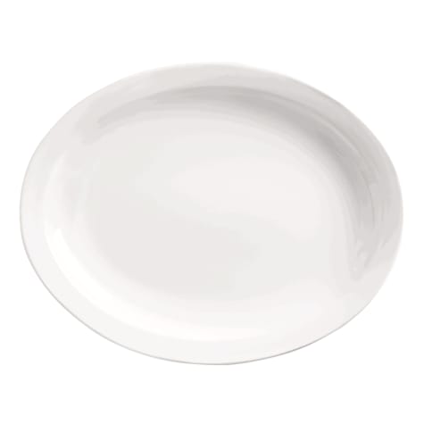 This narrow rim oval platter features the pure, bright white body and simple design of the Porcelana line.