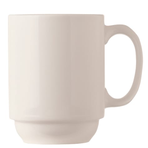 This World® Tableware Basics 11‐1/2" ounce mug is stackable. It has an elegant design and is made from porcelain with a bright white color that goes well with any dinnerware.