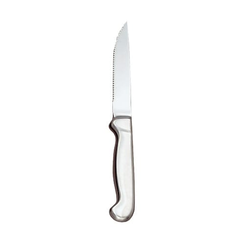 This hollow handle Slim Radiant steak knife features an all‐stainless steel construction with a pointed tip and a satin finish. These knives are commercial dishwasher safe.